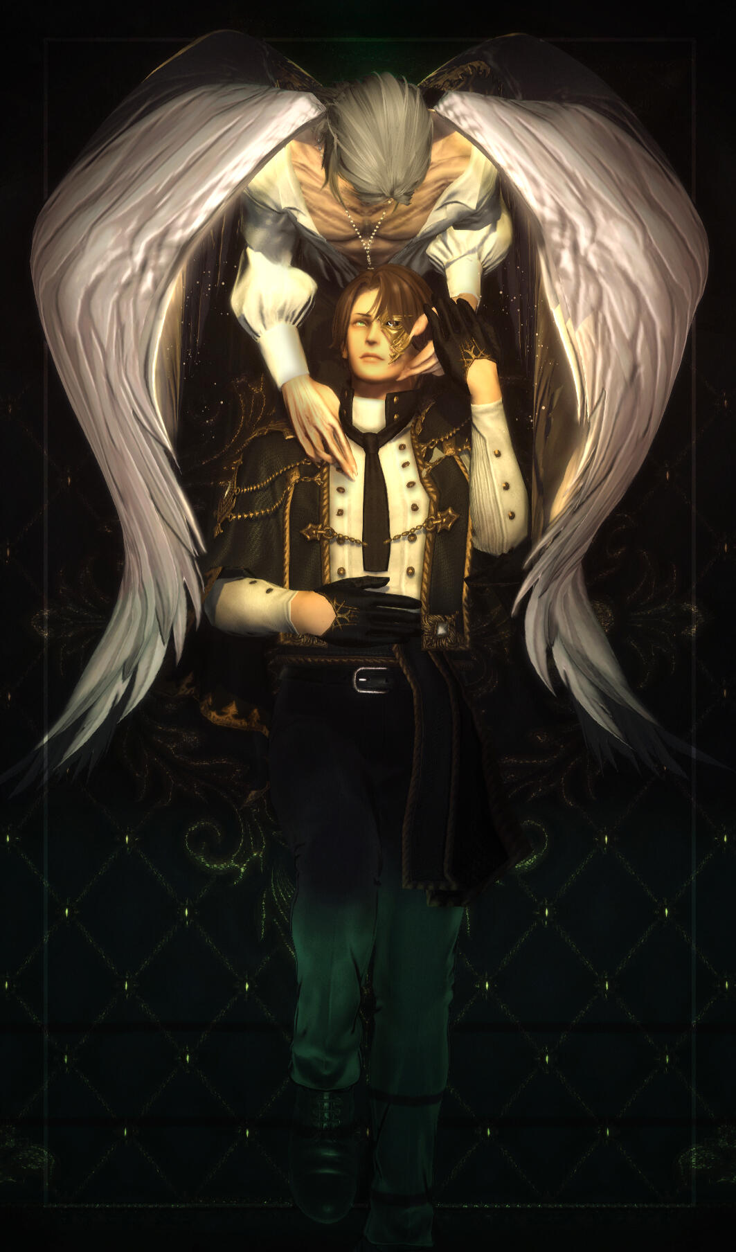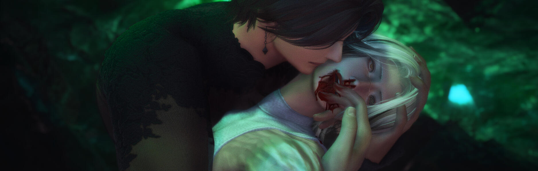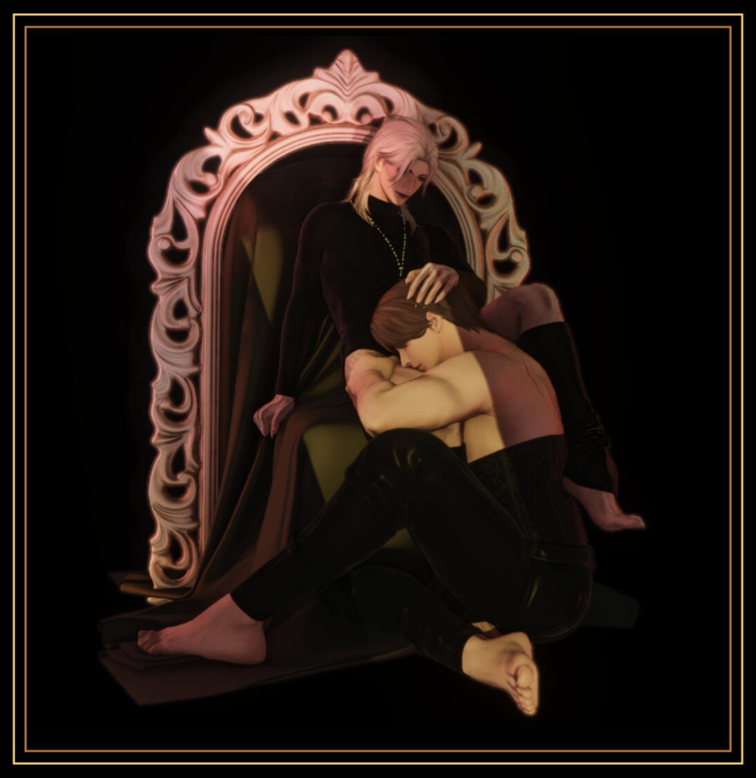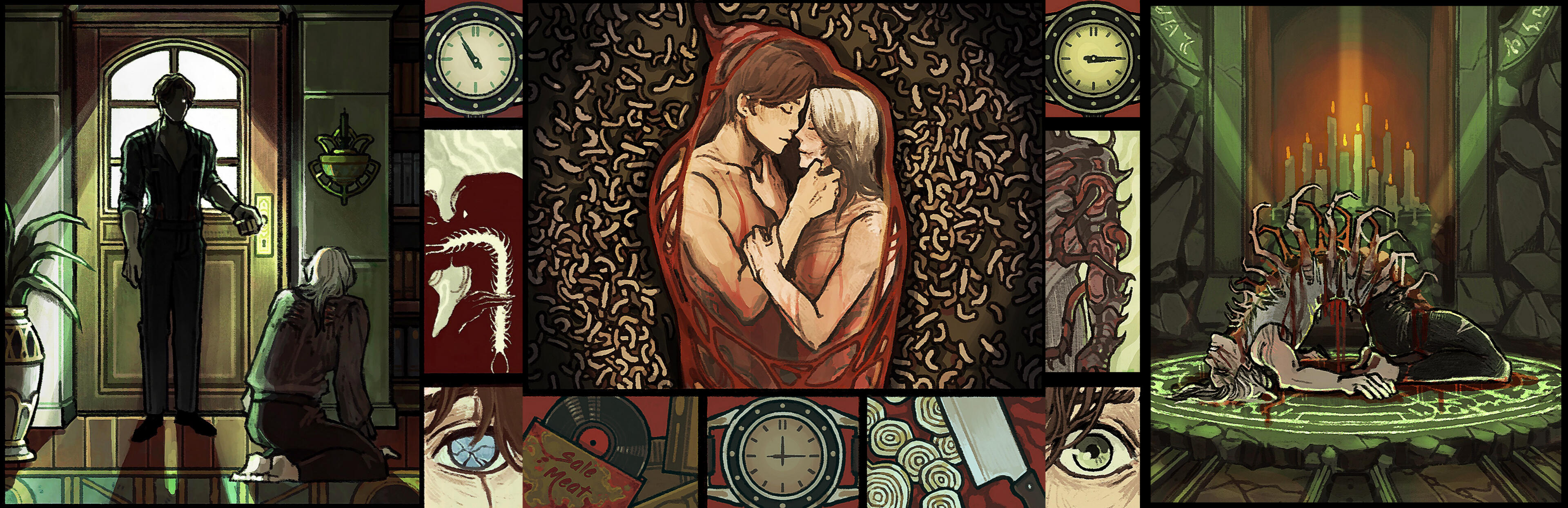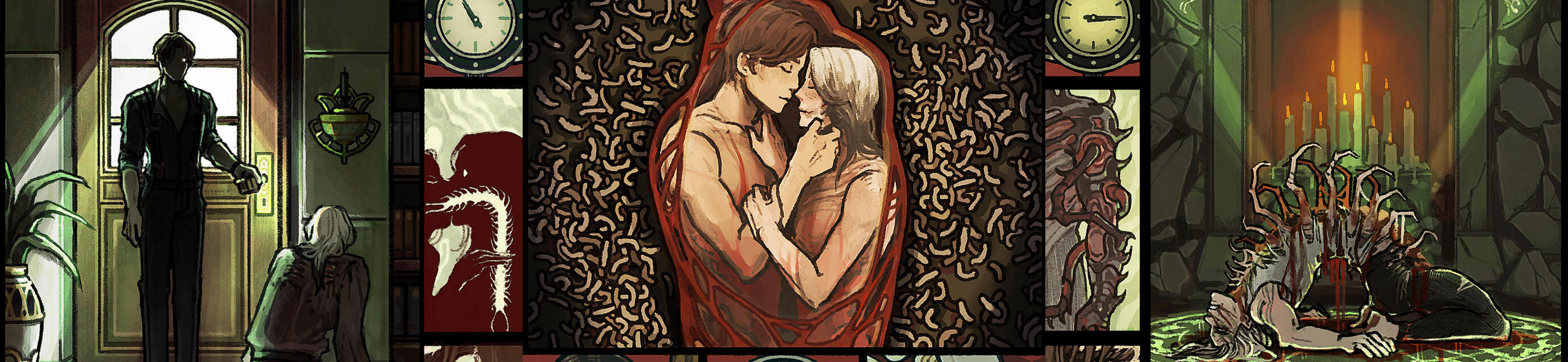 Death itself comes as a painless whisper, a permission to rest; body put to good use and his heart still bound in a distant dream he canβt, wonβt and does not want to recall. It would rob it of its beauty, this warm embrace that envelops his shuddering soul.Rebirth is what cuts like an iced knife through heart, mind and body. Pieces rended from one another come together in violent defiance, soul torn from its relief and cleaved flesh stitched into a mockery of the fate that once befell it. Bound to meat once more, heavy where it lies ingloriously lifeless in the nude. From where he is bornβ from Mother or Messiahβ canβt be known, but he feels it in the blood that flushes hot through skin remade. Too hot, body slick and steaming.Aleksandr frees his shepherd from its casket of flesh, undoes one of too many tragedies for the day. Twin-sized shoulders hang limp inside his grip, aslumber amidst the viscera that sluices down the cuts and curves of features heβs never known to look so helpless. So peaceful, too.Consciousness comes to Shiloh as a mottled film. Membrane clings to his brow, casting the world and its ever-spinning axis in a pale pink hue. Weightlessβ leadenβ his limbs drag across floors starkly cold, but he hasnβt the strength to shiver. His neck lolls, lone eye rogue in the way it rolls inside its socket to grasp the room.What remains of their audience are but robes collapsed in each corner of the chamber, bodies smeared flat from where their worship has come to end. Mere stains of ever having existed.Was that what awaited them all? Consumption, the final reward.He canβt meet lilacs proper where they strain overhead, but knows the grit inside the breath that chitters. The arms around his chest feel thinner than expected. Had Aleksandr always been so small? Words still foreign to his tongue, he expels but a dark dribble to flow past lip and jaw. Ichorous, not blood but tar. He breathes in ragged through thick-strung threads, breathes twice harder, then quiets and blots out of being.He swims, falls, tumbles in and out of systems not yet ready to heed his call. But his lungs swell strong in Aleksandrβs arms.